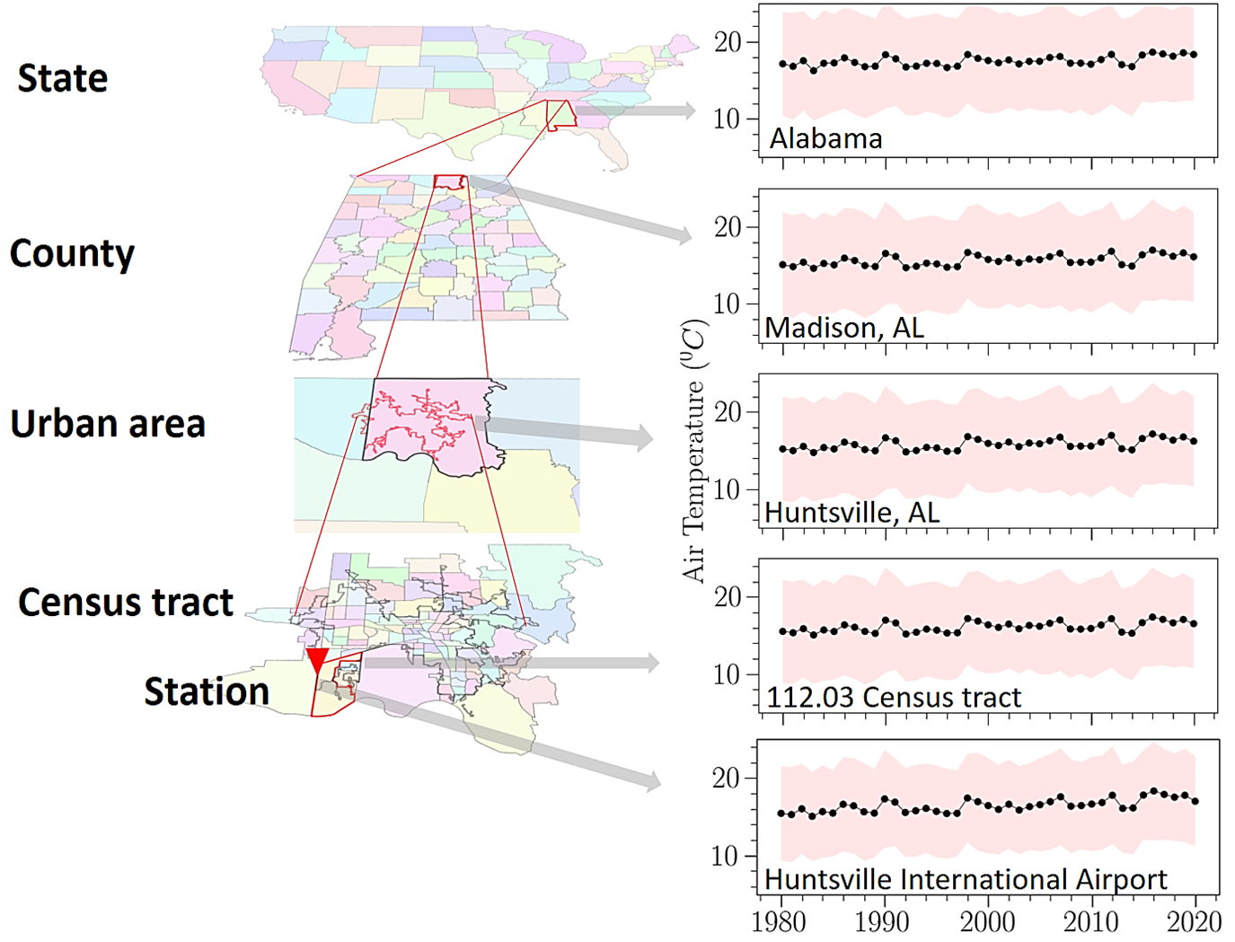 This task focuses on identifying how historical and future variations in climate patterns at various scales affect energy systems by synthesizing long-term observational data and simulations from 1980 to 2060, ranging from local to state levels (illustrated in Figure 2). Results will be integrated into Task 1.1 to provide more comprehensive testing of climate hypotheses.